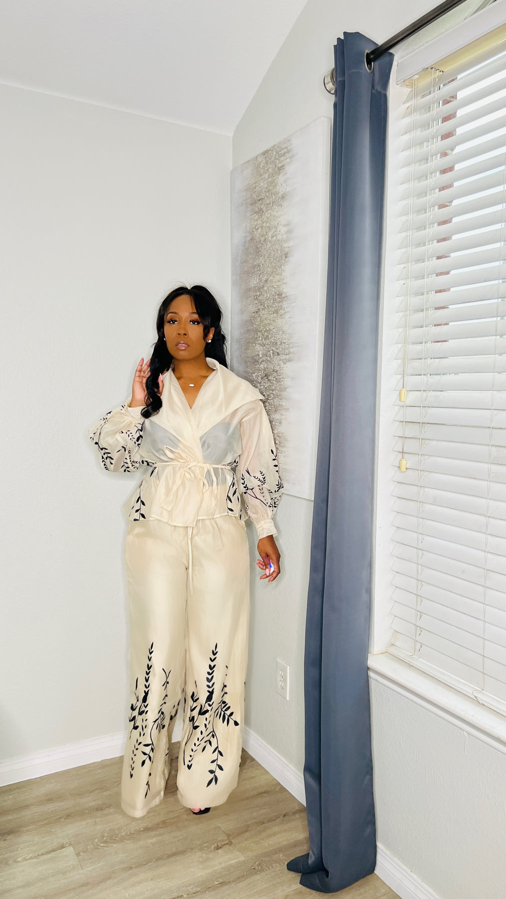 The Classic Pant Set in cream, featuring a V-neck top with long sleeves and a self-tie belt